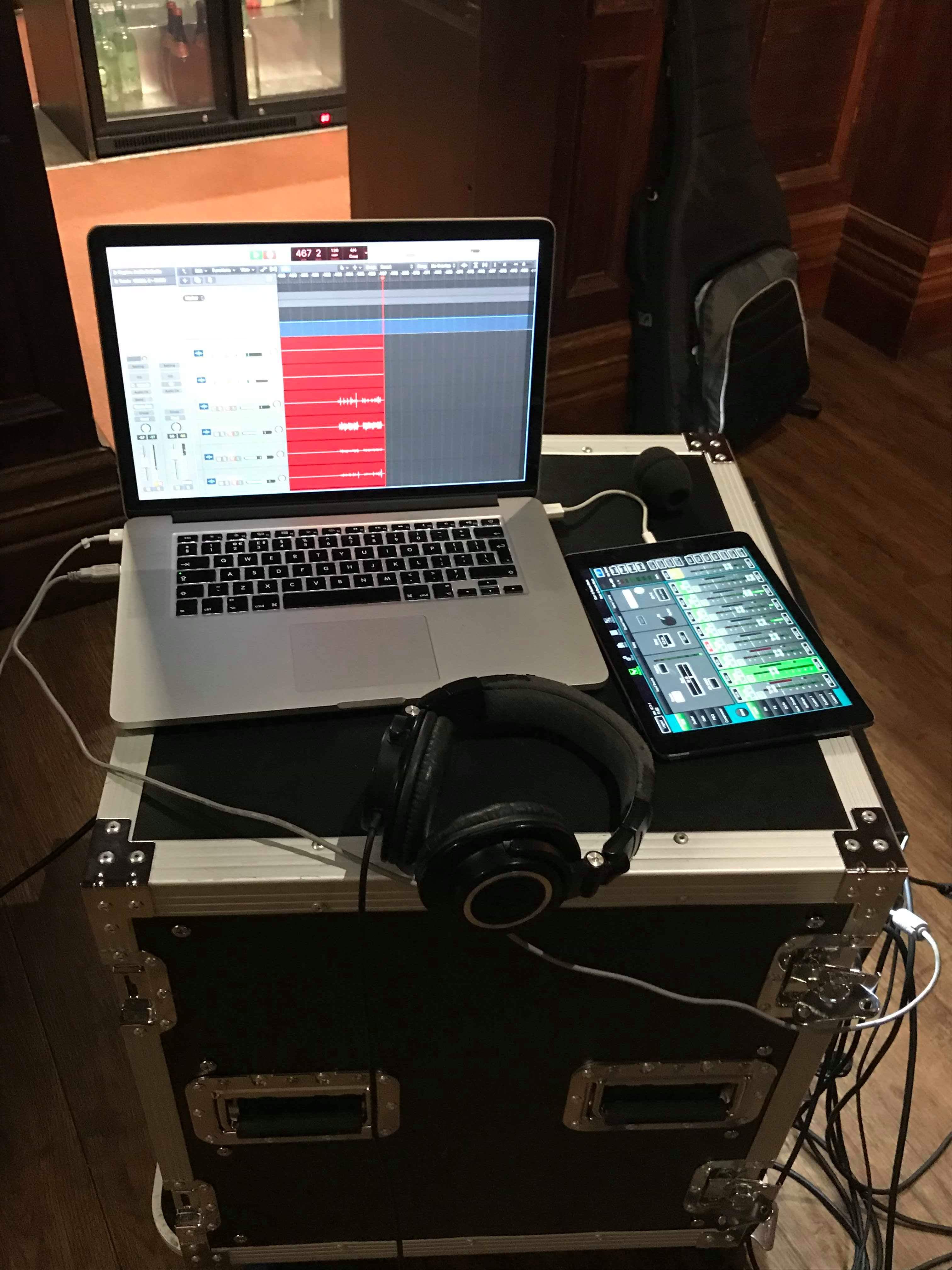 A Macbook pro laptop running Logic Pro X DAW recording software which was monitored via a mixing app on a Apple I pad and plugged into the mixer connections at the back of the case.